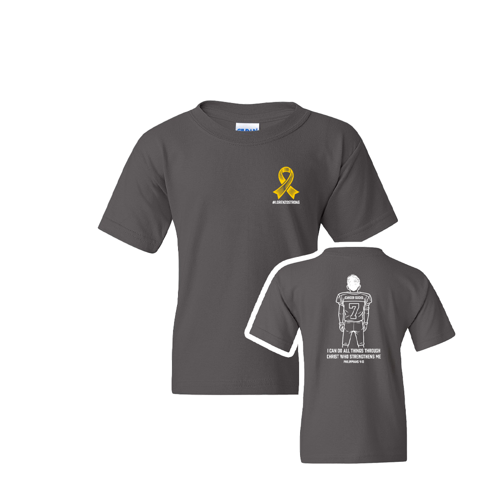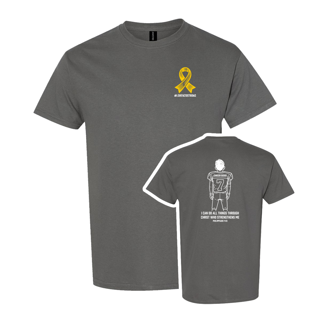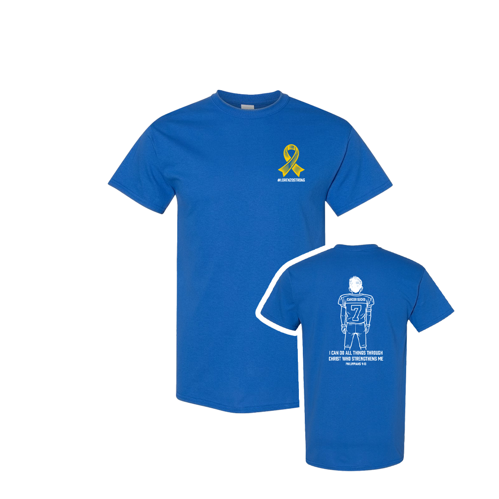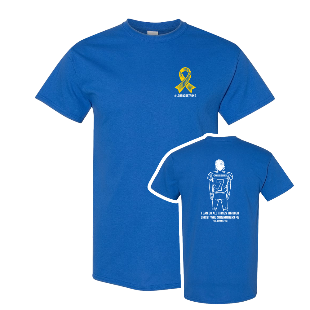 Lorenzo helped design this shirt himself! He wanted to include his "Cancer Sucks" jersey from last year, which he wore to support cancer awareness—never imagining that just 5 months later, he'd be living this fight himself.